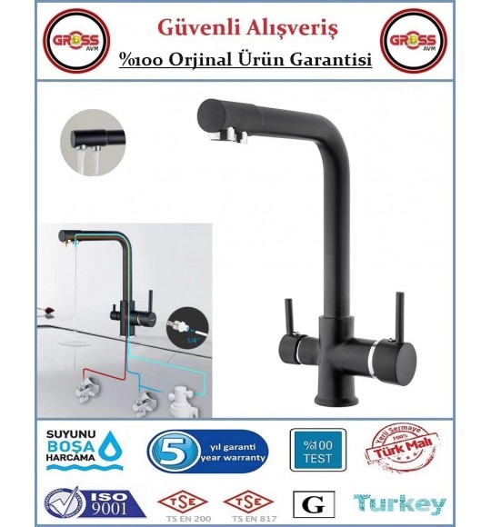 • Uzay Su Arıtmalı Mutfak Evye Bataryası - 3 Yollu - Sıcak, Soğuk, Arıtma Çıkışlı - Siyah