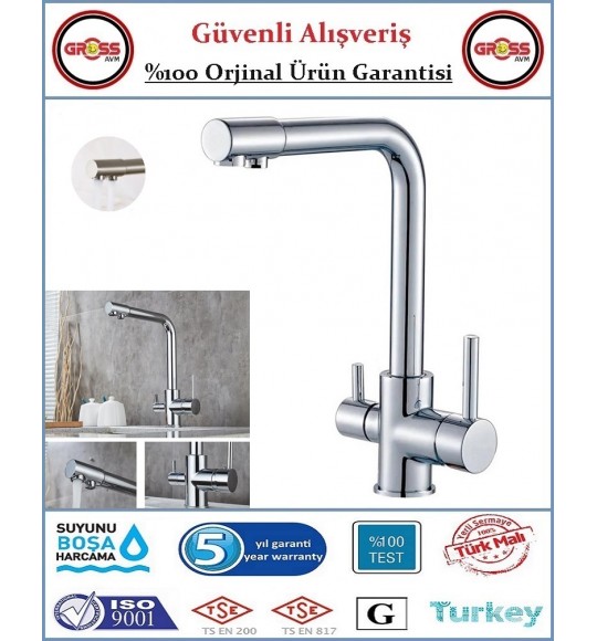 Uzay Su Arıtmalı Mutfak Evye Bataryası - 3 Yollu - Sıcak, Soğuk, Arıtma Çıkışlı - Krom
